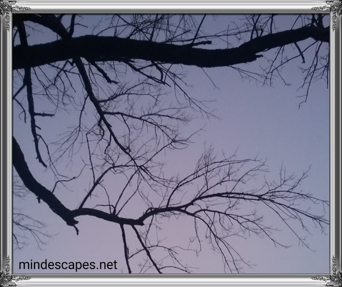 [Begin scene] A dark sky turns blue as the dawn grows brighter from the rising sun… The view broken by outreaching branches leafless, bare… Stark against the early dawn sky the branches look like a system of rivers and streams, draining the night from the sky, unveiling the blue once hidden within… A tree preparedContinue reading “Scene: Draining the Sky”