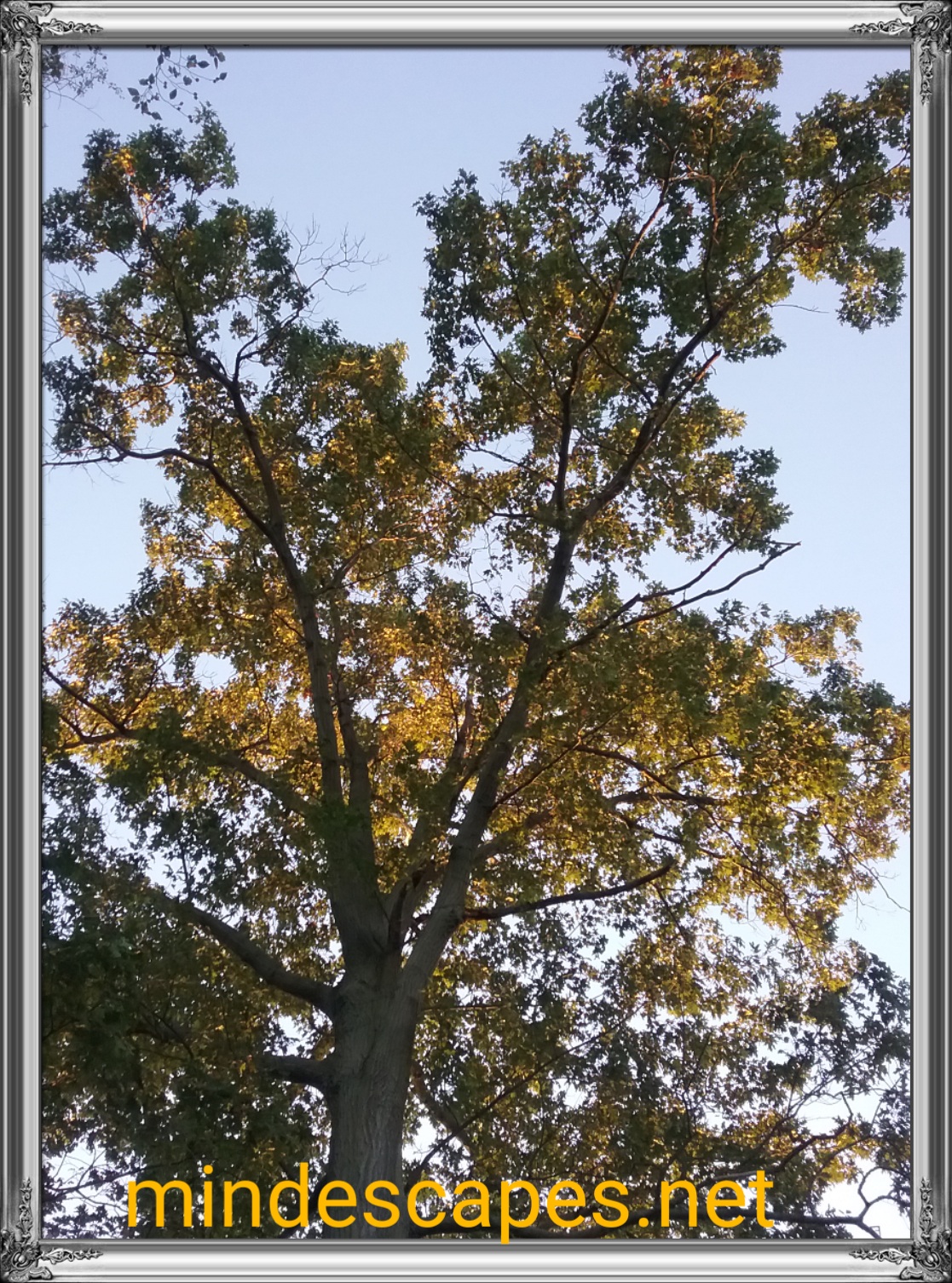 [Begin scene] A mighty oak, limbs stretched forth, reaches up high as if holding the sky… Bathed in light from the setting sun, its leaves take on a golden hue… The darker bark covered limbs stand out clearly showing many years of growth… An old soul, this tree, older than you or I, it hasContinue reading “Scene: Mighty Oak”